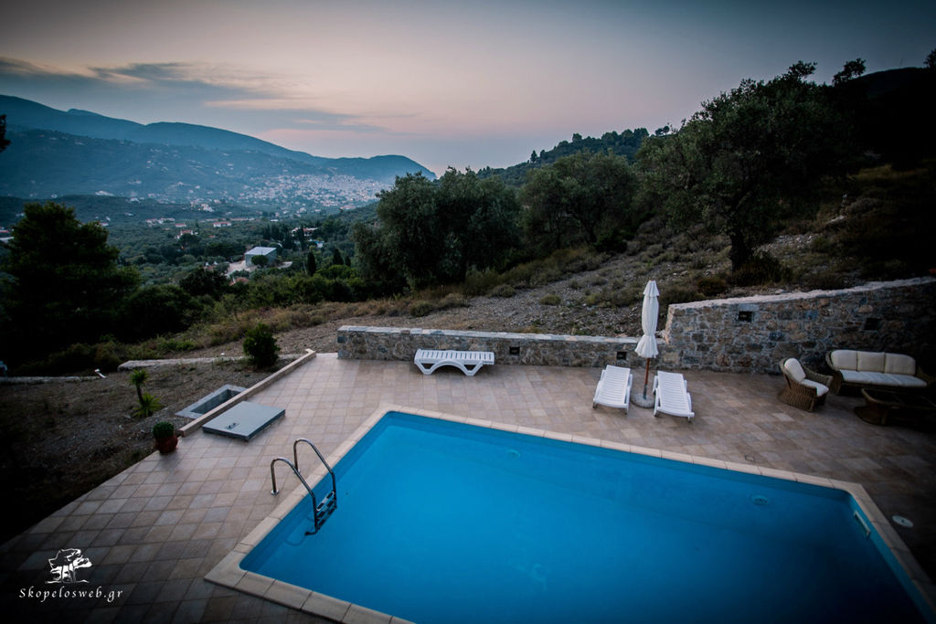 Οι επισκέπτες του Villa Evelyn μπορούν να χαλαρώσουν στην ηλιόλουστη βεράντα γύρω από την πισίνα με θέα στο τοπίο της Σκοπέλου.